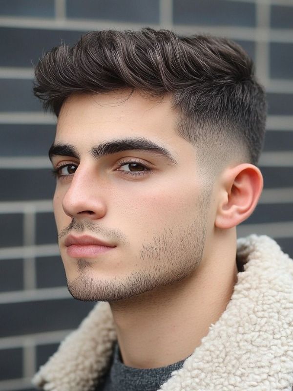 The fluffy style with a taper fade works well if you have naturally thick hair. The top is kept longer and styled with volume, while the low taper haircut blends the sides.