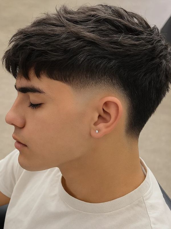 The wavy fringe taper fade keeps texture in the front with a fringe, while sides taper down. It looks youthful and stylish.